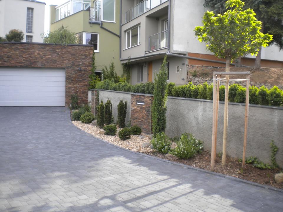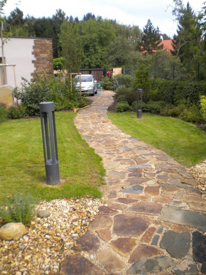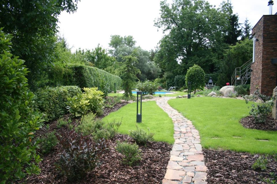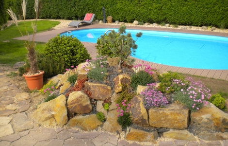 Rozlehlá zahrada s bazénem, okrasnou vodní plochou a solitérními kamen
